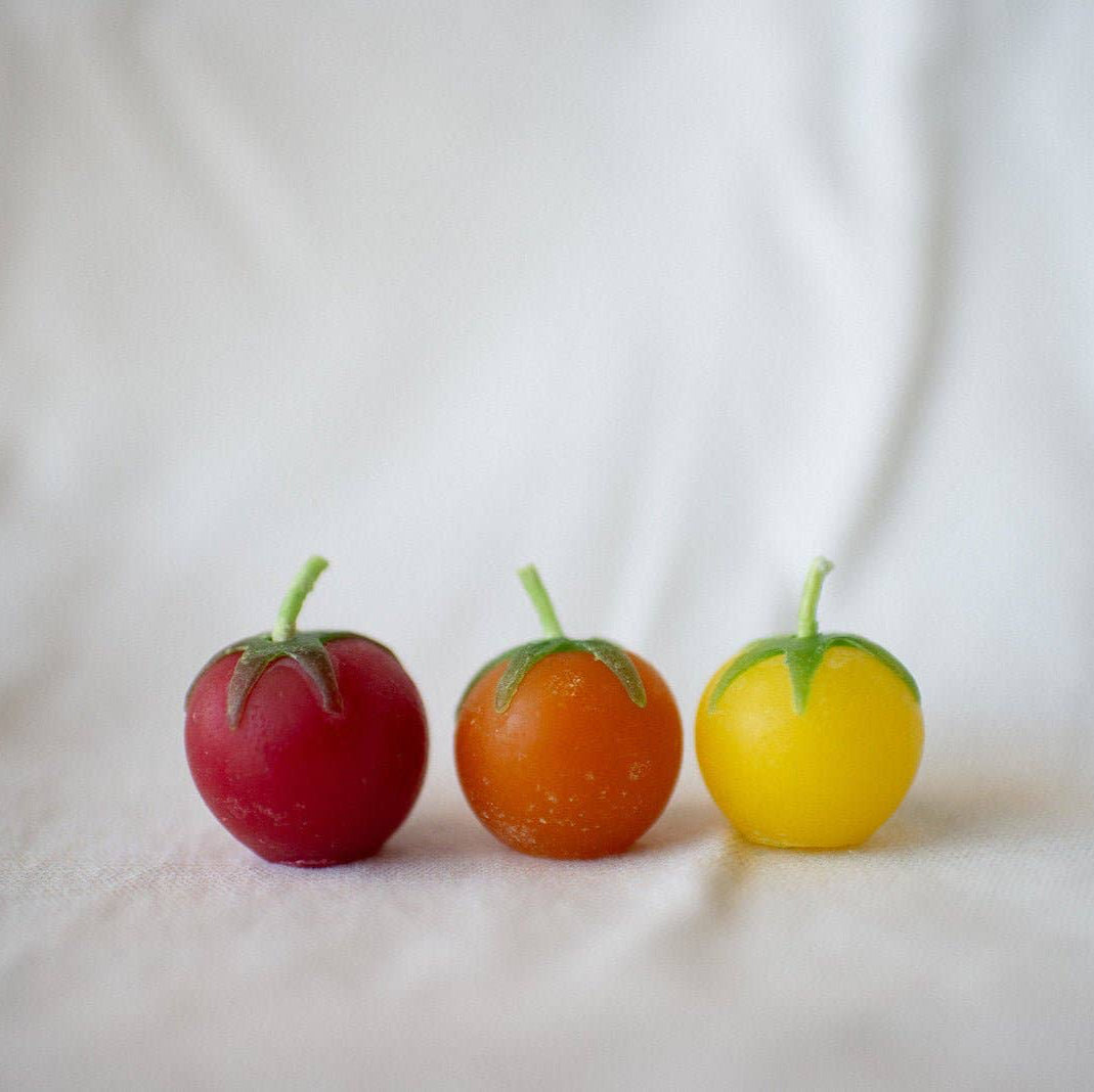 Experience the charm of our Cherry Tomato Birthday Candles, meticulously crafted from pure beeswax harvested from our family-owned hives in scenic Merced, CA. As third-generation beekeepers, we've perfected the art of infusing love and heritage into each little flame. I was inspired by my family’s legacy in agriculture when I created these candles. Each candle is uniquely shaped using molds cast from real cherry tomatoes! Illuminate your special moments with a touch of warmth, nostalgia, and an irresistible dash of cuteness.