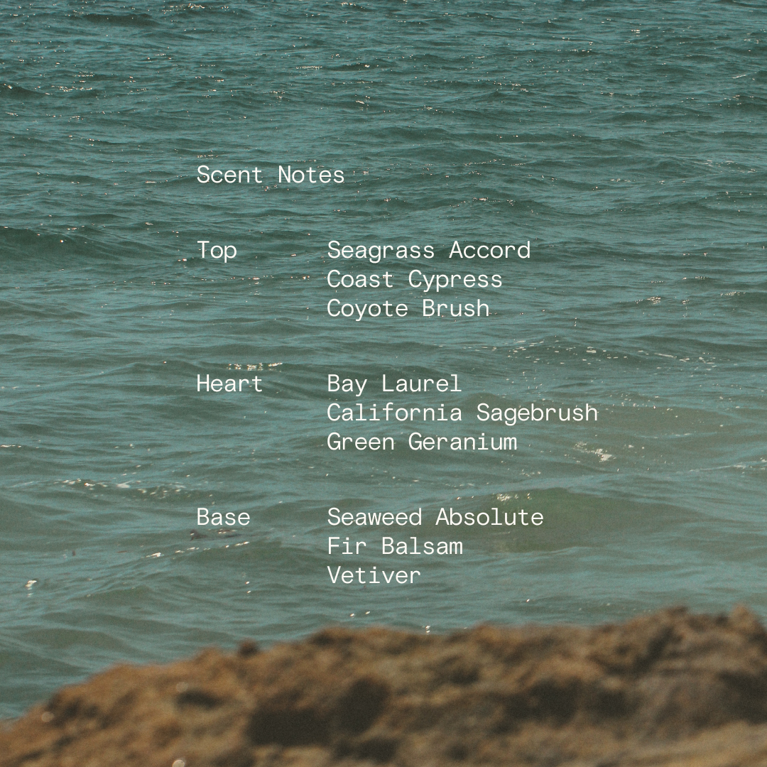 Scent Notes: Top: Seagrass Accord, Coast Cypress, Coyote Brush Heart: Bay Laurel, California Sagebrush, Green Geranium Base: Seaweed Absolute, Fir Balsam, Vetiver